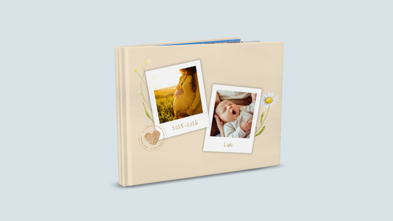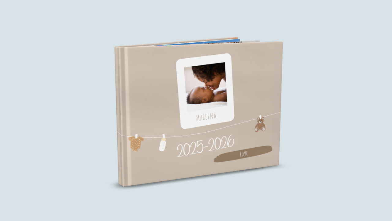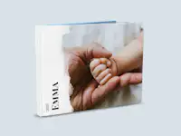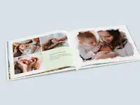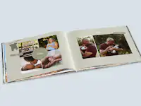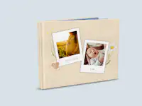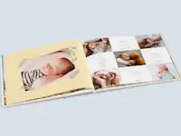 Un design simple et moderne avec différentes mises en page et de petits encadrés de texte pour votre album photo de naissance.